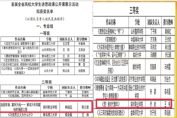 近日,由山东省教育厅主办的首届全省高校大学生讲思政课公开课展示活动获奖名单公布,我院在此次比赛中荣获二等奖、三等奖各一项。其中,由陈义新、王紫璇、纪莲莲老师指导,韩淑品同学主讲的作品《治国有道,富民为始——解读共同富裕的强国之路》获二等奖;由王锐、刘云飞、董佳影老师指导,乔昕同学主讲的作品《燃!新时代青年》获三等奖,且均被推荐备赛国赛。