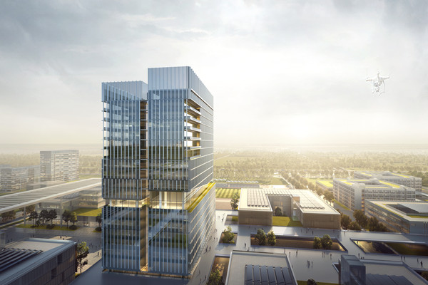 黄河三角洲智能制造实训基地建筑面积3万平方米,为五层框架结构钢筋混凝土U型建筑,东西长100米,南北长87米。一层南北楼分别为两个开放式车间,层高6米,主要用于校企合作或社会服务,二至五层层高4.2米,南楼主要布局为小班化教室,北楼主要为教学实训一体化实训室,东楼主要为行政办公、教研室及研发中心等,一层与二层以上以高架步行连廊相对性分隔,既可方便学生实习实训,又可独立面向社会经营。