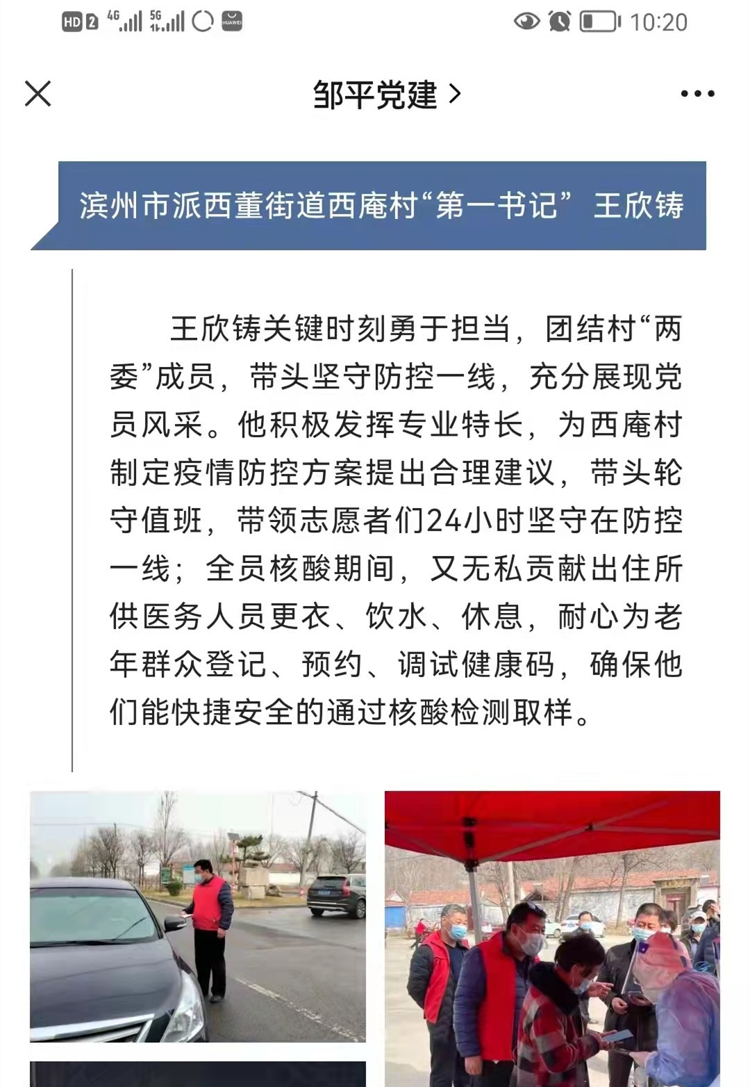 面对今年骤起的新冠肺炎疫情,王欣铸同志团结全村党员干部、普通群众积极参与检查站点执勤、防疫物资筹集、生活物质配送、全员核酸检测等各项工作,严格落实疫情防控举措。作为一名医务工作者,他结合在学院保健防疫科工作时积累的丰富传染病防控工作经验,及时制定了《2022年西庵村封村防控新冠肺炎工作方案》《西庵村核酸检测工作方案》,确保了西庵村疫情防控工作有章可循;作为第一书记,他和邻村第一书记房新村同志一起,自费购买方便面、八宝粥等生活物资捐赠给村值守点;作为一名党员,当需要转运次密接者时,他冲在最前面;当开展全员核酸检测时,他无私贡献出住所作为核酸检测服务站;作为一名村民,他主动加入到封村志愿者们队伍中,24小时坚守在防控一线,耐心地为老人们登记、预约、调试健康码。